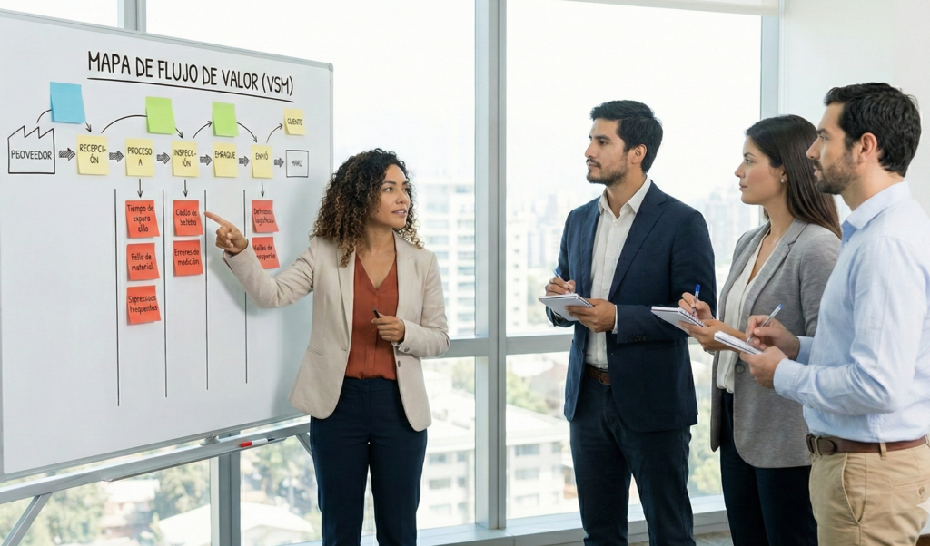 Visualice el flujo completo de sus procesos desde la perspectiva del cliente. Identifique cuellos de botella y desperdicios ocultos para diseñar un estado futuro más ágil y rentable.